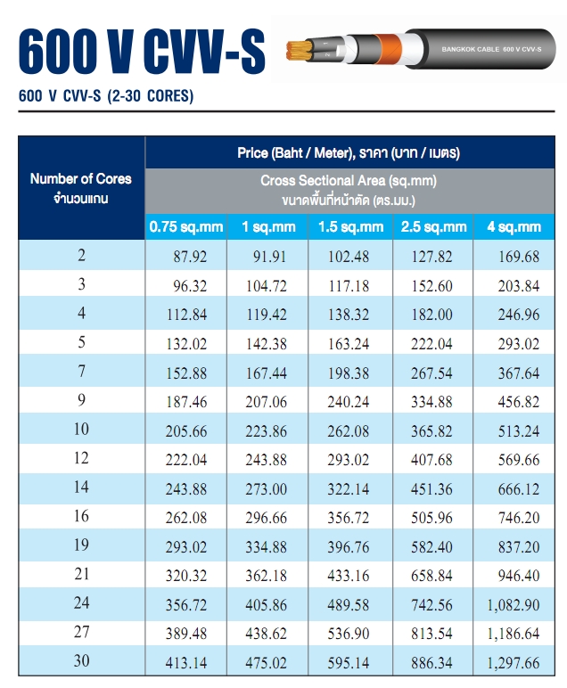 สาย 600 V CVV-S คือ สายไฟฟ้าทองแดงหุ้มฉนวนมีเปลือกนอก PVC ชนิดสายอ่อน แบบมีชั้นชีลด์เทปทองแดงเพื่อป้องกันคลื่นสัญญาณรบกวน ใช้สำหรับเป็นสายคอนโทรล มีขนาดตั้งแต่ 2 แกนถึง 30 แกน